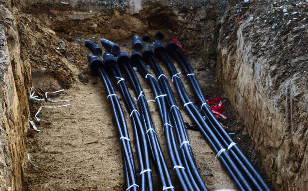 Expert installation of mains cabling from network pillars to metre boxes with correct segregation, depth, and protection according to distributor specifications.